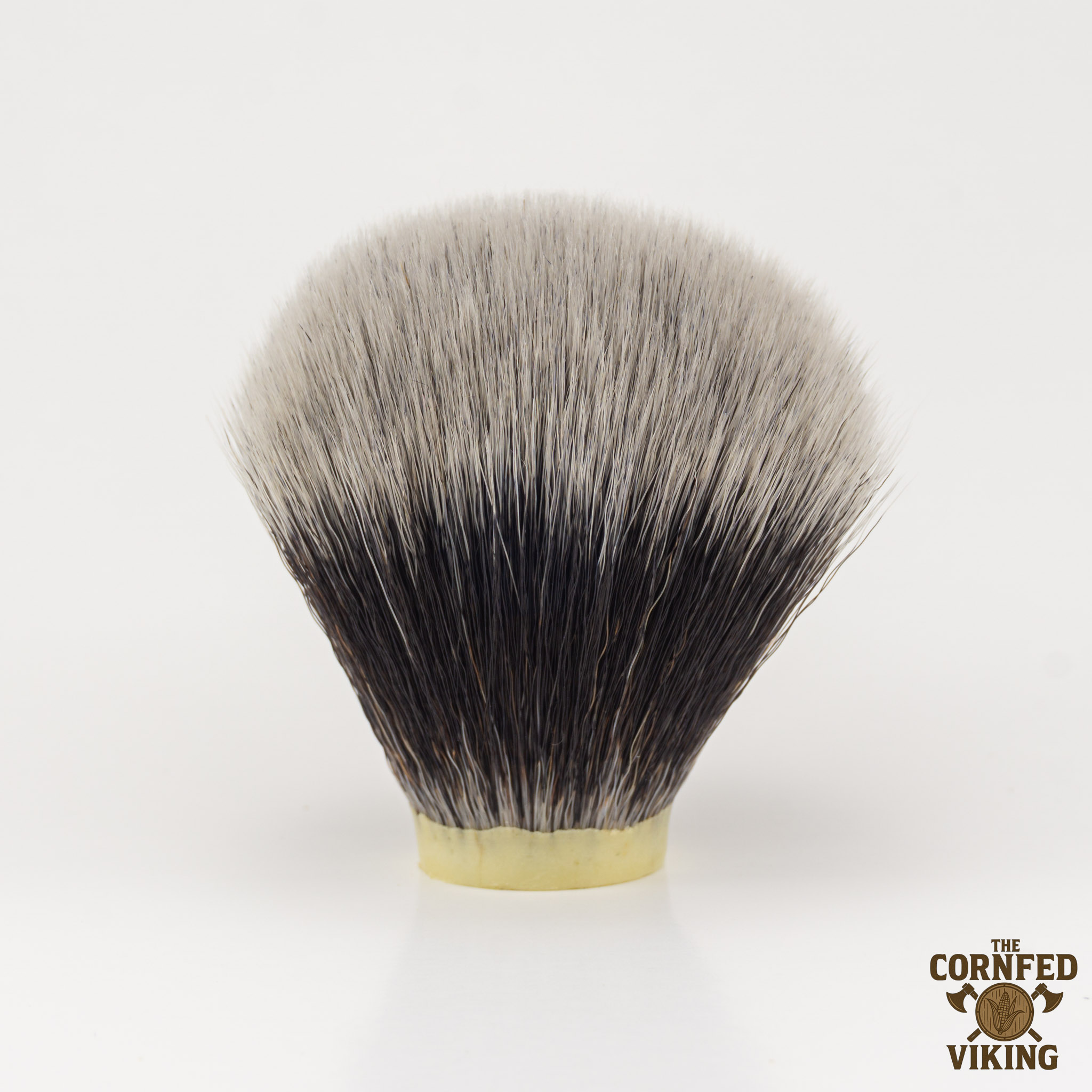 These synthetic knots mimic the look of 2-band badger hair knots and offer medium backbone and ultra soft tips without the scritch you get from badger. This combination provides a great lathering experience. 26mm base knot diameter.