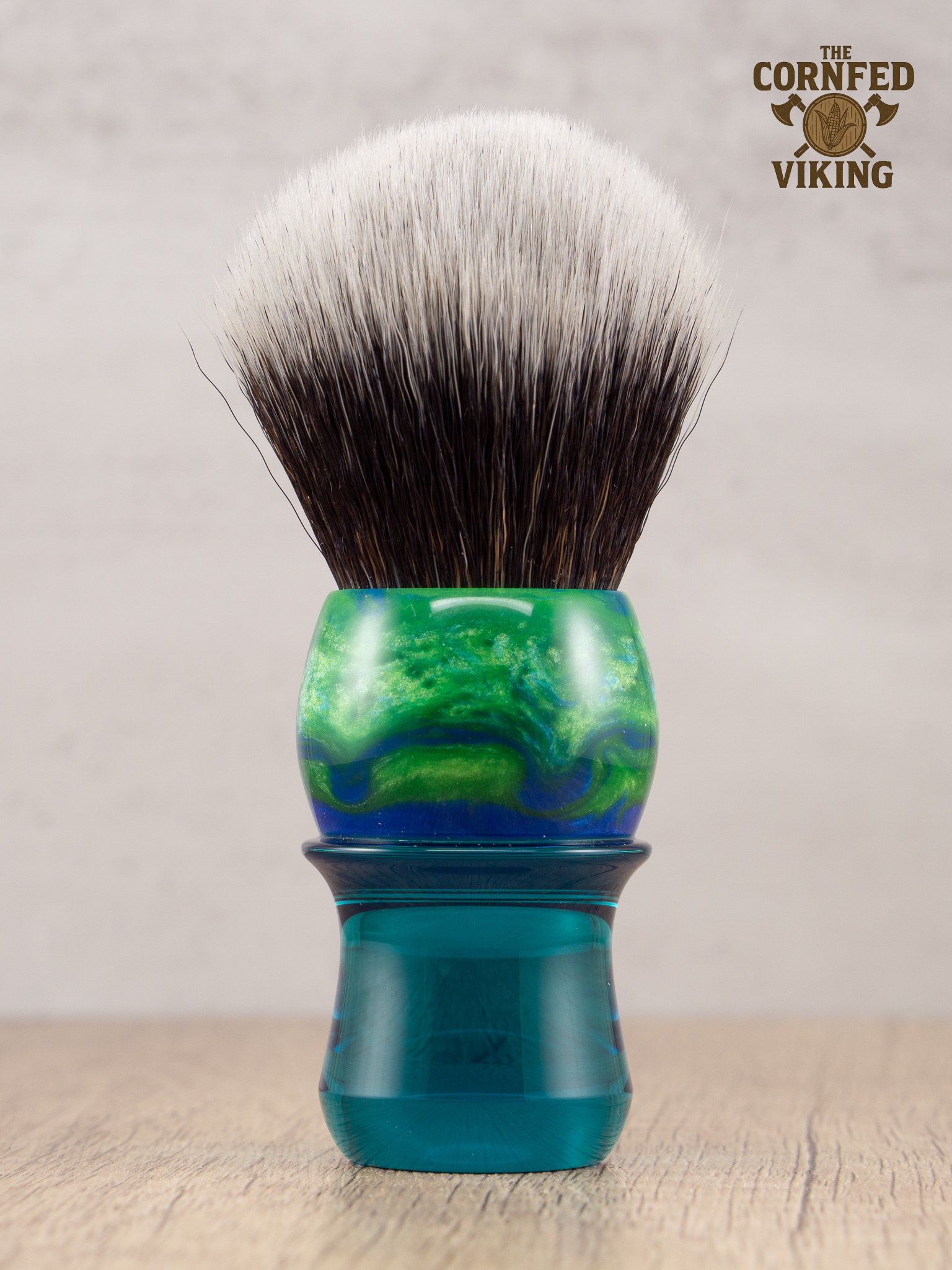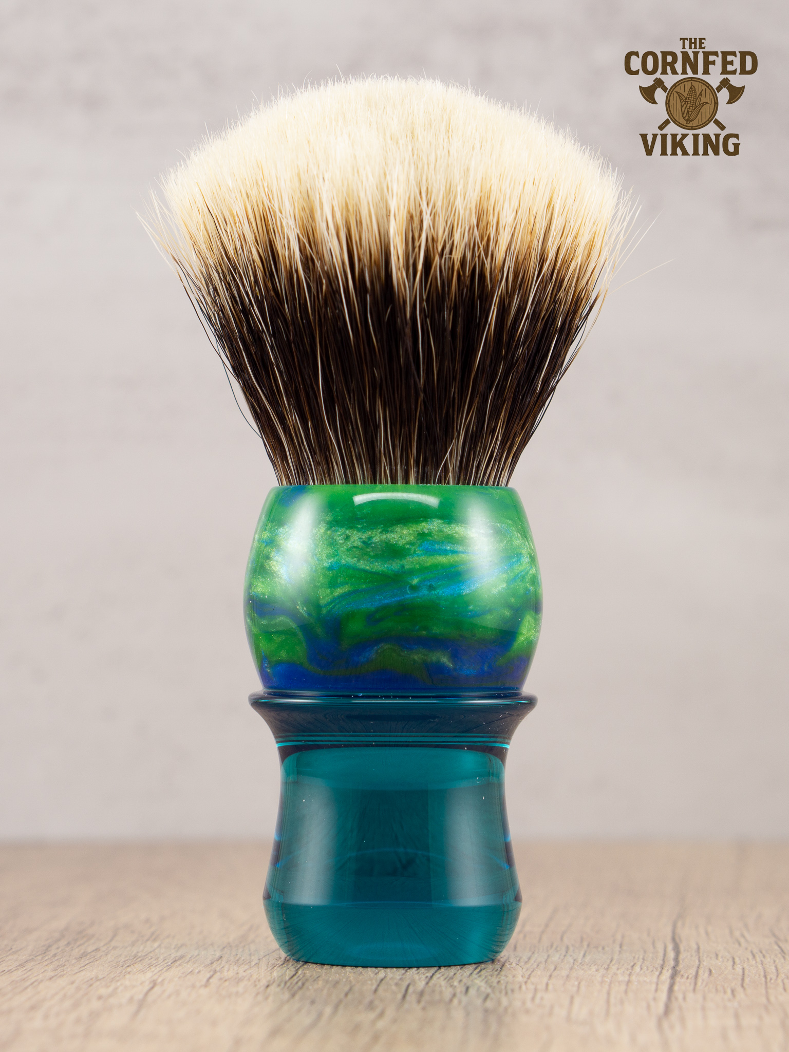 This handle showcases a combination of blue and green pearl resins atop translucent cyan, all polished to a high gloss. The shape is ergonomic and will allow for easy bowl or face lathering.